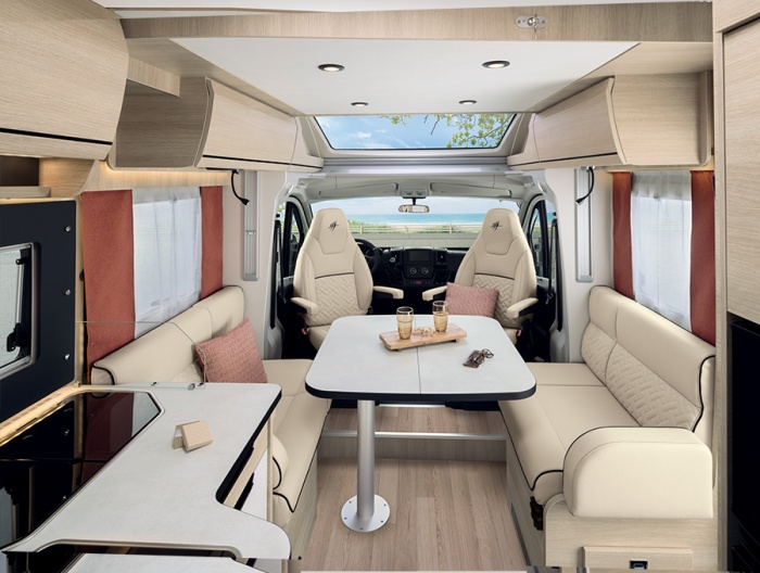 Bei der Innenausstattung wählen Sie die Atmosphäre, die zu Ihrem Stil passt: LUCEO oder NACARAT. Bei den Polsterungen stehen PALMA und NOUMEA* zur Auswahl. Die Jubiläumsmodelle 666F und 696F anlässlich des 65-jährigen Bestehens von RAPIDO verfügen über eine exklusive, bestickte Polsterung mit dem Logo «65 Jahre» (PALMA und NOUMEA).