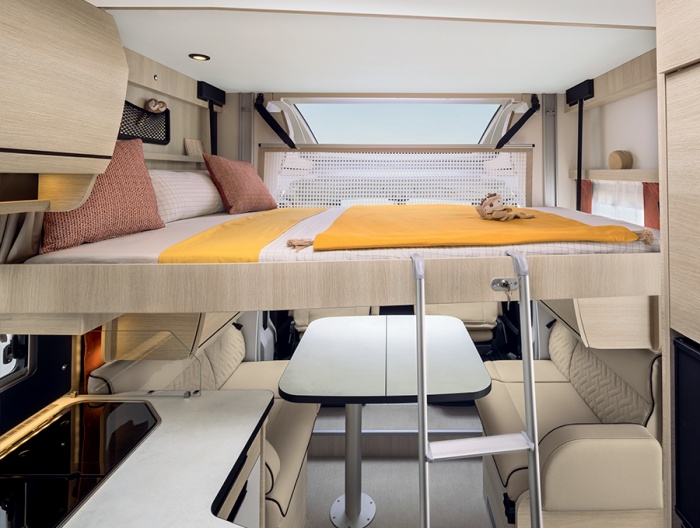 Möchten Sie Ihr Modell der Baureihe 6F ganz nach Ihren Wünschen konfigurieren? Optional können Sie sich für ein elektrisches Hubbett für zwei Personen entscheiden. Im Modell 606F ist dieses Hubbett serienmäßig verbaut. So stehen Ihnen insgesamt vier Schlafplätze im Fahrzeug zur Verfügung.
