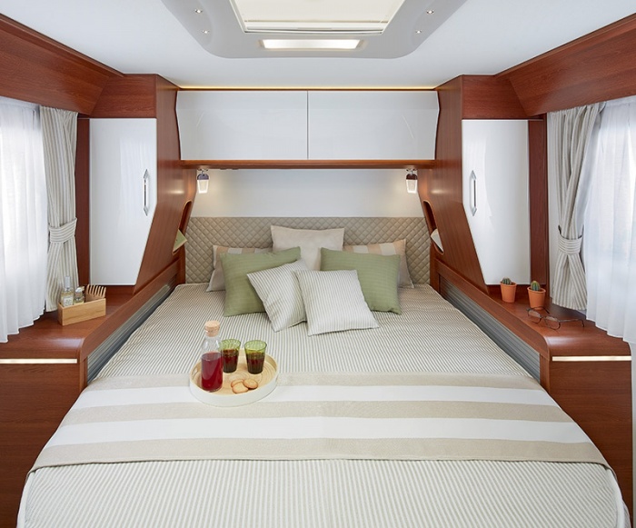 Die Modelle der PREMIUM EDITION sind in den zwei bestehenden Ambiente-Varianten verfügbar: ELEGANCE (warm und raffiniert mit Massivahorn und glänzendem Finish) und CASTELLO (moderner Farbton mit glänzendem Finish). Die DISTINCTION Modelle sind mit den gewohnten exklusiven Möbeln mit Oberschranktüren in glänzendem Weiß ausgestattet. Bei allen Modellen verschönert die spezifische Polstervariante TEP* PARIS die Innenräume.