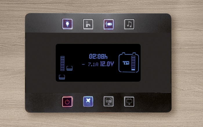 Ab diesem Zeitpunkt wird jede Nutzung von Strom in Ihrem Wohnmobil nicht mehr durch die Energie Ihrer Batterien begrenzt, da diese an eine stärkere Energiequelle angeschlossen sind (daher der positive Ladestrom). Die verbleibende Autonomie kann daher nicht angezeigt werden, da die Batterien ständig aufgeladen werden.